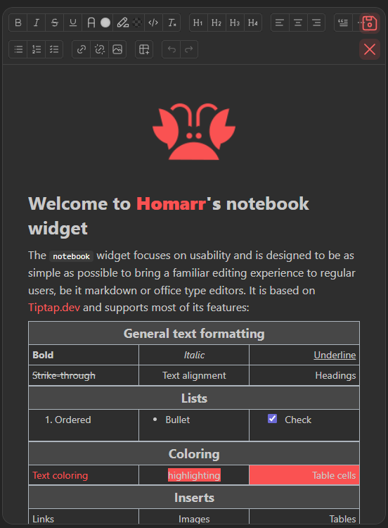 The notebook widget focuses on usability and is designed to be as simple as possible to bring a familiar editing experience to regular users. It is based on Tiptap.dev and supports most of its features.